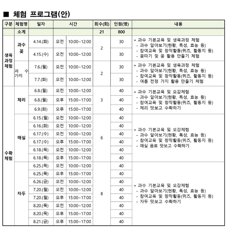 프로그램은 4월부터 10월까지 운영한다. 4~7월에는 과수 꽃과 가지를 관찰하는 생육 과정 체험이 진행되고, 6~10월에는 체리·매실·자두·포도·배·사과 등을 수확하는 체험 프로그램이 이어진다.