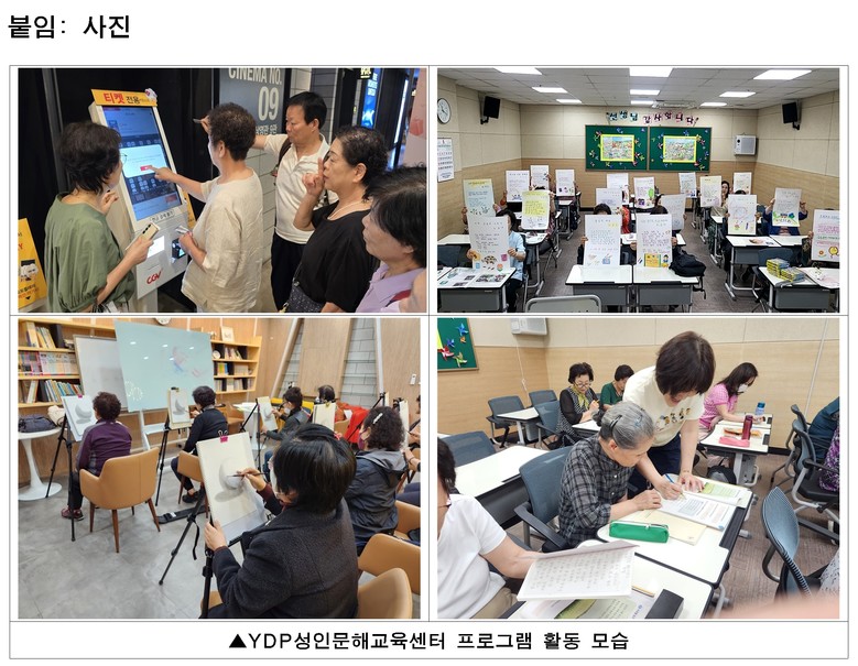 ‘YDP성인문해교육센터’는 구에 거주하는 중‧장년층과 어르신, 결혼이민자 등을 대상으로 기초 학습부터 학력 인정 과정까지 단계별 문해교육을 제공하는 평생교육 기관이다. 단계별 한글 교실부터 정보 기술(IT), 기초 인문학 등 다양한 과정을 학습 수준에 맞춰 제공해 수강생들의 학습 역량 향상을 지원하고 있다.