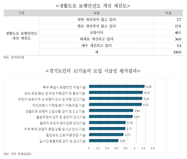 경기연구원이 경기도민 1,000명을 대상으로 설문조사를 한 결과, 도민들은 보행 안전을 매우 중요하게 생각하지만 현재의 안전 개선 수준에는 만족도가 높지 않은 것으로 나타났다. 도민들이 가장 필요하다고 꼽은 AI 기술은 ‘폭우나 폭설 시 보행 안전 지원 기술’(4.19점/5점 만점)이었으며, ‘망가진 보도블록 자동 감지’(4.15점), ‘어린이 보호구역 내 위험 경고’(4.14점) 등이 그 뒤를 이었다.