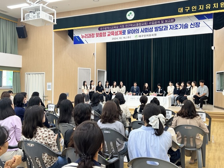 [대구 세계타임즈=한윤석 기자] 대구 최초 통합 단설유치원인 대구인지유치원(원장 장윤정)은 지난 10월 16일(수) ‘누리과정 맞춤형 교육설계로 유아의 사회성 발달과 자조기술 신장’을 주제로 연구학교(통합교육) 공개수업 및 보고회를 개최하였다.