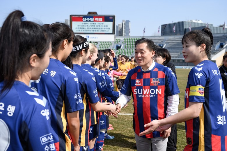 | ▲ 이재준 수원특례시장이 수원FC위민 선수단을 격려하고 있다. |