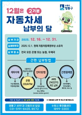 자동차세 정기분은 매년 6월과 12월 두 차례 정기적으로 부과되며, 이번 12월 정기분 자동차세 부과 대상은 2025년 12월 1일 현재 영통구에 등록·신고되어 있는 자동차, 건설기계(덤프, 레미콘차량) 및 이륜자동차(125cc 초과)로, 납부 기간은 오는 12월 16일부터 12월 31일까지이다.