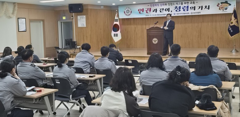 [대전 세계타임즈=이채봉 기자] 대전시 자치경찰위원회(위원장 박희용)는 19일 대전유성경찰서와 20일 동부경찰서 소속 자치경찰사무 담당 경찰관 및 일반직 직원 100여 명을 대상으로 인권.청렴 교육을 진행했다.