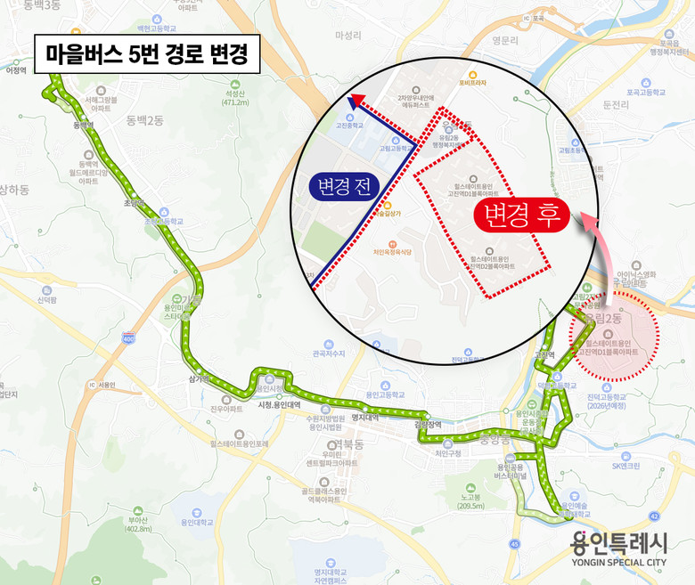 [용인시 세계타임즈=송민수 기자] 용인특례시(시장 이상일)는 오는 10일부터 시내버스 8번과 마을버스 5번이 유림2동 고진역 힐스테이트 1,2 단지 내부를 경유하도록 노선이 변경된다고 8일 밝혔다.