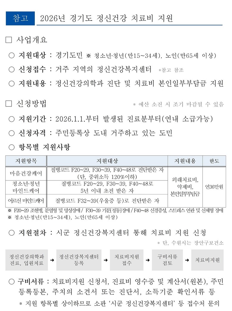 경기도는 질환 기준에 따라 외래 진료비 본인부담금을 연 최대 36만 원까지 지원하며, 도민이 치료를 지속할 수 있도록 돕고 있다. 스트레스나 우울감 등 마음의 어려움을 겪는 경우라면 일반 도민 누구나 가까운 정신건강복지센터를 통해 상담과 지원을 받을 수 있다.