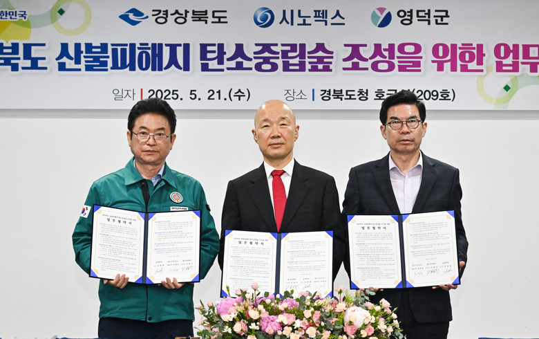- 영덕 산불피해지역, 친환경 관광 자원조성 기대 - [경북 세계타임즈=한윤석 기자] 경상북도는 21일 경북도청 회의실에서 ㈜시노펙스, 영덕군과 함께 ‘산불피해지 탄소중립숲 조성을 위한 업무협약’을 체결했다.
