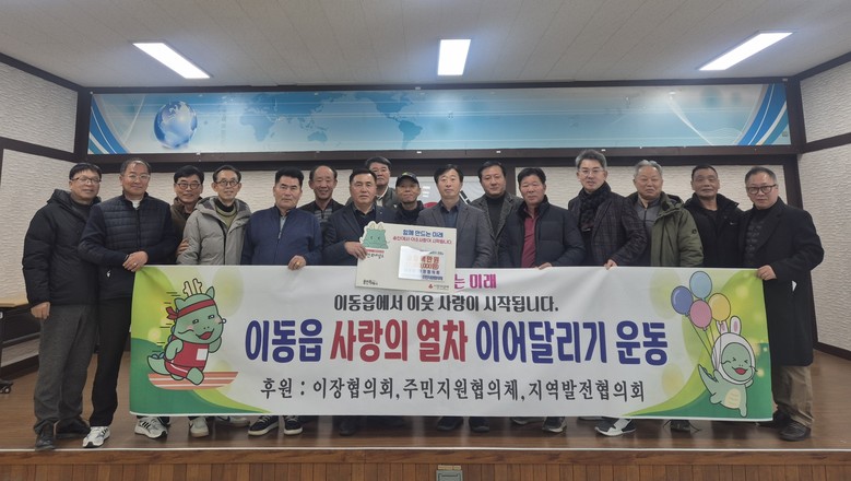 이동읍 이장협의회·주민지원협의체·지역발전협의회는 지난 6일 700만 원을 기탁하며 사랑의 열차 이어달리기 운동에 동참했다. 이동읍 주민지원협의체 김학목 회장은 “작년에 이어 올해도 사회복지공동모금회를 통한 용인시 사랑의 열차 이어달리기 운동에 동참하기로 뜻을 모았다”며 “앞으로도 따뜻한 지역사회 만들기를 위해 함께 노력해 나가겠다”고 했다.