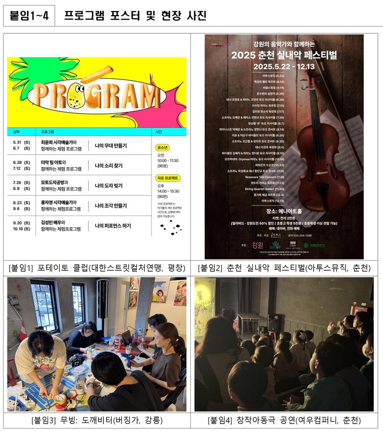먼저, 예술공간 지원 프로그램으로는 ▲평창올림픽 시설을 활용한 ‘2025 포테이토 클럽(대한스트릿컬처연맹, 평창)’▲체험형 예술프로젝트 ‘무빙: 도깨비터(버징가, 강릉)’▲‘예술꽃 피는 숲에서(예숲밭사이로, 춘천)’▲‘얼굴등등 다큐멘터리 아트프로젝트(봄내춤단, 춘천)’▲‘흑멸백흥, 천년의 사유(삼탄아트마인, 정선)’가 있으며,