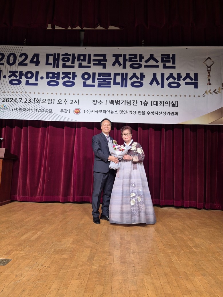 [세계타임즈]최성룡기자 = (사)한국외식창업교육원 주최 시사코리아뉴스 주관으로 2024대한민국 자랑스런 명인.명장 인물대상(大賞) 시상식을 오는 7월23일(화)오후2시 백범기념관에서 개최됐다.