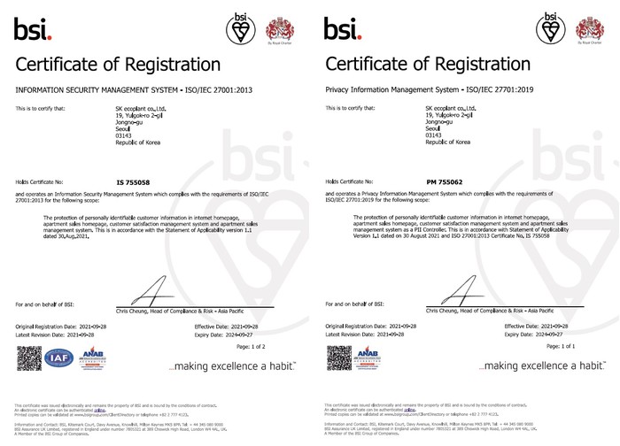 SK에코플랜트는 정보보호 강화를 위해 국제 인증 뿐만 아니라 국내 인증인 한국인터넷진흥원 개인정보보호 관리체계(PIMS)를 지난 2015년 취득해 유지해오고 있다. 나아가 통합 인증인 한국인터넷진흥원 정보보호 및 개인정보보호 관리체계(ISMS-P)도 연내 취득 예정이다.