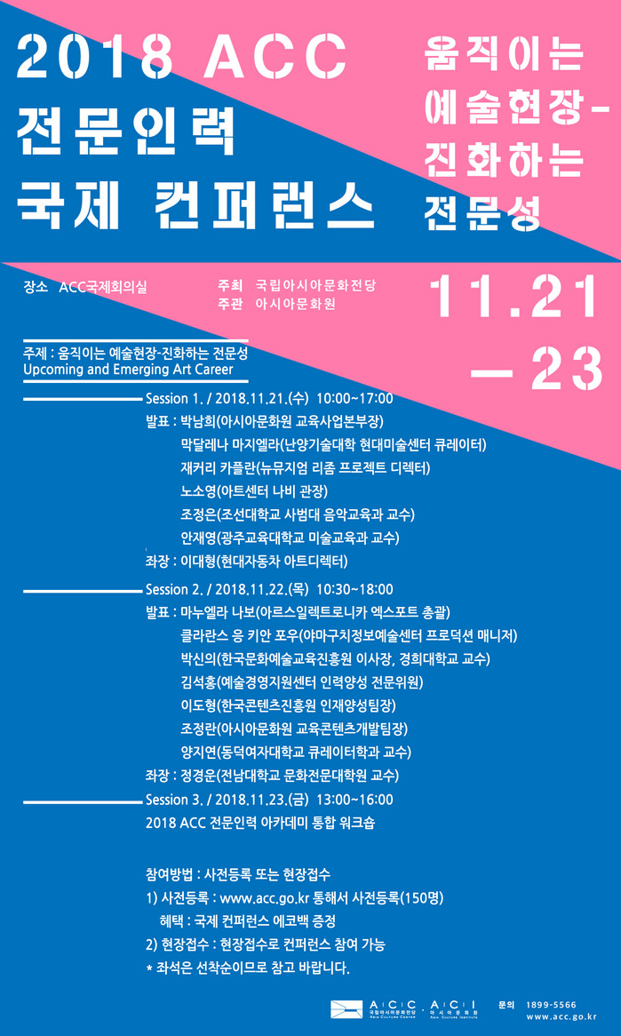 [광주=세계타임즈 손권일 기자]2018 ACC 전문인력 국제 컨퍼런스’가 오는 11월 21일부터 23일까지 부터 국립아시아문화전당 국제회의실에서 열린다. 금번 국제 컨퍼런스는 ‘움직이는 예술현장_진화하는 전문(Upcoming and Emerging Art Career)’라는 주제로 21세기 문화예술현장에서 요구되는 새로운 전문인력의 수요와 그 사례에 대해 논의하는 자리로, 국내외 연구자 및 문화예술기관 관계자 14명이 발제자와 토론자로 참석한다. 빠르게 성장하는 전문인력 양성분야와 관련한 국내외 문화예술기관들의 현황을 공유하고, 깊이 있는 담론을 형성하기 위해 개최되는 이번 행사는 국립아시아문화전당(전당장 직무대리 이진식, ACC) 주최, 아시아문화원(원장 이기표 ACI)주관으로 진행된다.