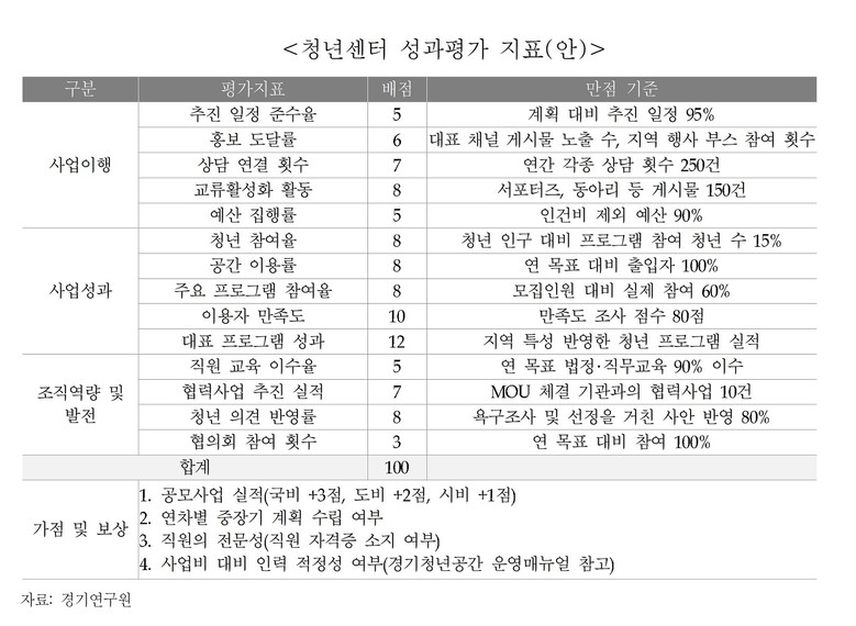 이에 연구진은 청년센터 성과를 총 100점 만점으로 평가하는 관리체계를 제안했다. 평가는 사업 추진이 계획대로 이뤄졌는지, 청년에게 실제 도움이 됐는지, 조직이 지속적으로 성장할 수 있는지를 종합적으로 살피는 방식이다. 예를 들어 연간 사업 일정 준수율 95%, 예산 집행률 90% 이상 여부를 확인하고, 청년 인구 대비 프로그램 참여율 15%, 공간 이용 목표 달성 여부, 이용자 만족도 80점 이상 같은 지표로 성과를 판단하도록 했다. 직원 교육 이수율이나 지역 기관과의 협력사업 실적도 함께 평가해, 청년센터 운영의 안정성과 확장 가능성까지 살폈다.