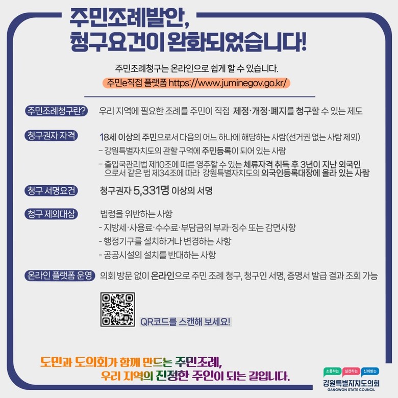 김시성 강원특별자치도의회의장은 “주민조례청구제도는 우리 도에 대한 도민의 의견을 도정에 직접 반영할 수 있는 중요한 제도”라며, 제도의 실효성을 높이기 위해 적극적으로 홍보를 추진하고 향후 조례청구 현황에 따라 추가적인 요건 완화와 주민조례청구자 지원 방안을 적극 검토 중이라고 밝혔다.