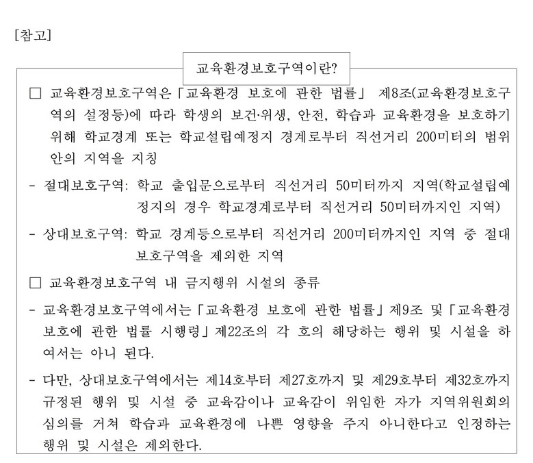주요 점검 내용은 ▲학교 경계로부터 200미터 이내 교육환경보호구역 내 무단 설치 유해업소 확인 ▲청소년을 대상으로 한 불법 영업행위 여부 점검 ▲청소년 보호 위반 사항 확인 ▲교육환경보호구역 제도 홍보물 배부 및 건전 영업 당부 등이다.