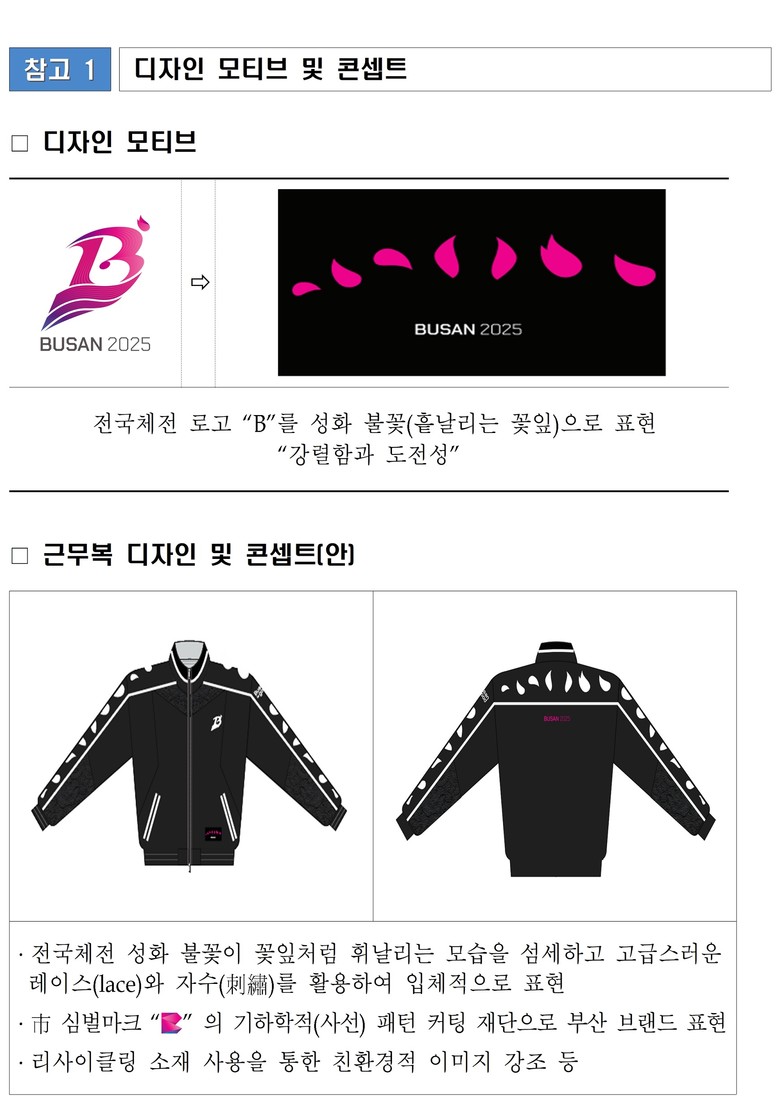 이번 전국(장애인)체전 근무복은 ▲시와 전국체전 상징인 '알파벳 비(B)' ▲'성화 불꽃' ▲'휘날리는 꽃잎' 등에 착안해 개발에 착수했으며, 섬세하고 고급스러운 레이스(Lace)와 자수(刺繡)로 25년 만에 개최되는 부산 전국체전의 강렬함과 도전성을 표현했다.