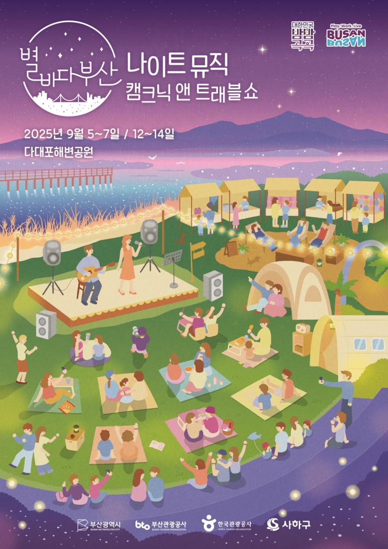 아울러, 9월 5일부터 14일까지 2주간 매주 금, 토, 일에는 다대포 해변공원에서 「2025 별바다부산 나이트뮤직 캠크닉* 앤 트래블쇼」가 개최된다.*캠크닉 : 캠핑+피크닉, 소풍을 가듯 도심 근교에서 가볍게 즐기는 캠핑