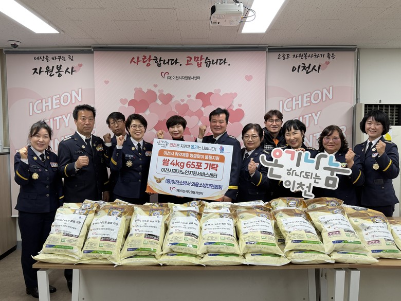 [이천시 세계타임즈=송민수 기자] 이천소방서 의용소방대연합회(연합회장 문용태, 서은화)는 2월 5일 다가오는 명절을 맞아 지역 내 취약계층을 돕기 위해 쌀 4kg, 65포를 (재)이천시자원봉사센터(센터장 이미선)에 지정기탁했다고 밝혔다.