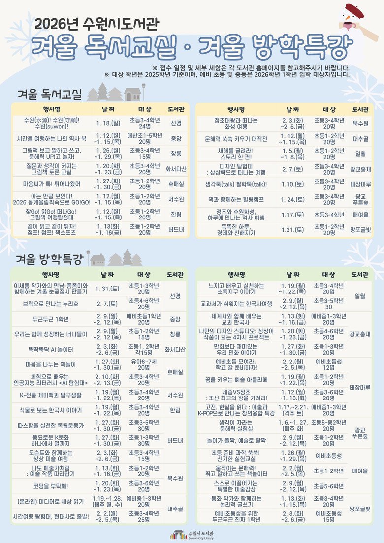 수원시도서관 관계자는 “겨울방학 동안 아이들이 책과 가까워지고 다양한 경험을 쌓을 수 있도록 프로그램을 준비했다”며 “도서관이 배움과 휴식이 공존하는 공간이 되길 바란다”고 말했다.