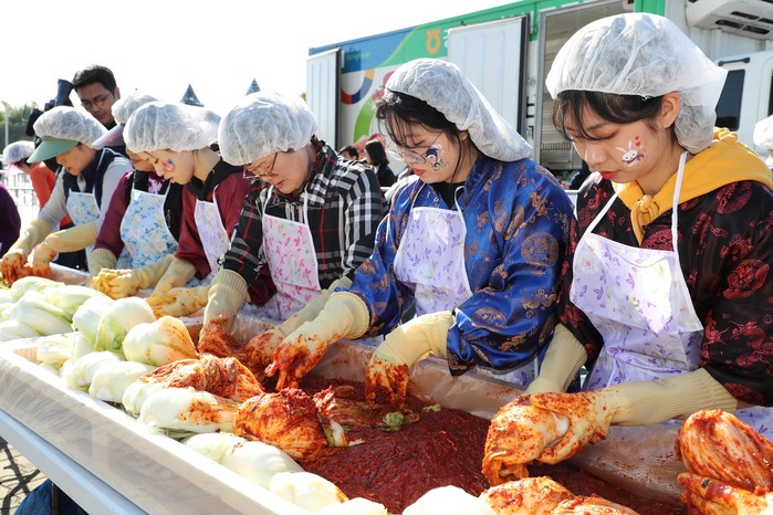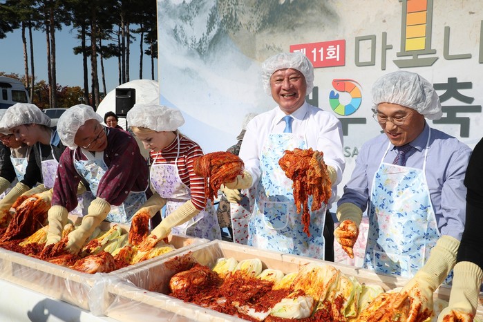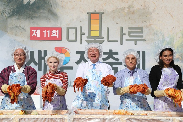 [외국인과 김치담그기] 19일(금) 서울월드컵경기장 평화의 광장에서 '제11회 마포나루 새우젓 축제'가 열렸다. 이날 유동균 마포구청장은 연세학당 대학생과 연남글로벌빌리지 및 마포구 거주 외국인들이 함께한 '외국인과 함께하는 김치담그기'프로그램에 참여했다.