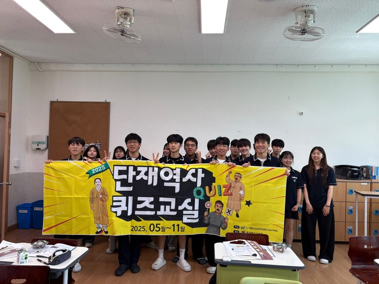 <찾아가는 단재 역사 퀴즈 교실>은 단재 신채호 기념사업회와 연계해 교실로 직접 찾아가 반별로 진행되는 참여형 역사교육 프로그램으로, 단재 신채호 선생의 독립운동 정신과 역사관을 학생들이 쉽고 재미있게 역사를 접할 수 있도록 퀴즈 형식으로 구성되었다.
