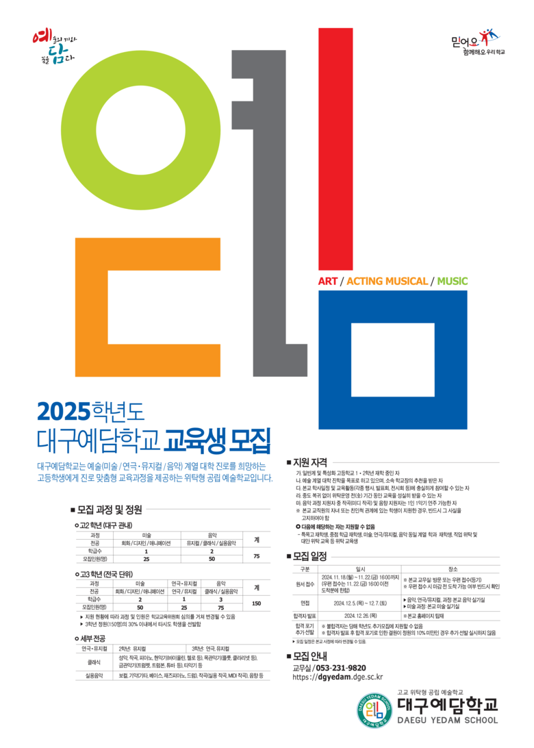 - 진로 맞춤형 교육과정으로 글로벌 예술 인재 양성 - [대구 세계타임즈=한윤석 기자] 대구예담학교(교장 최명호)는 오는 11월 2일(토)에 2025학년도 위탁교육생 모집을 위한 학교 설명회를 개최한다.