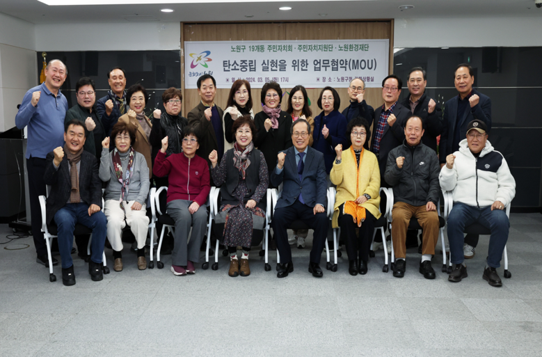 | ▲ 19개 동 주민자치회, 주민자치지원단이 노원환경재단과 동 단위 탄소중립 실현을 위한 업무협약(MOU)을 맺고 기념촬영을 하는 모습 |