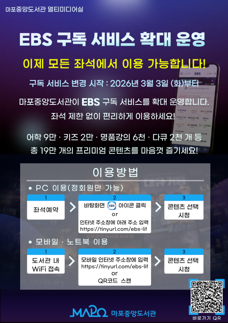 - 개인 모바일 기기, 노트북 등으로 도서관 WiFi 접속해도 서비스 이용 가능 [마포구 세계타임즈=이장성 기자] 마포구(구청장 박강수) 구립도서관인 마포중앙도서관은 이용자에게 편리하고 폭넓은 영상자료 서비스를 선보이기 위해 2026년 3월부터 ‘EBS Play+ 구독 서비스’를 확대 운영한다.