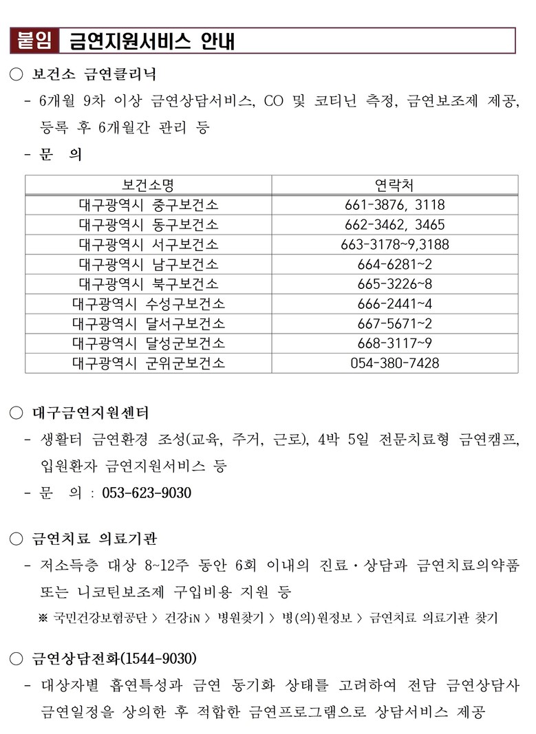 이재홍 대구광역시 보건복지국장은 “새해에는 시민들이 반드시 금연에 성공할 수 있도록 다각적인 금연지원 서비스를 제공해 담배 연기 없는 쾌적한 대구를 조성하는 데 최선을 다하겠다”고 말했다.