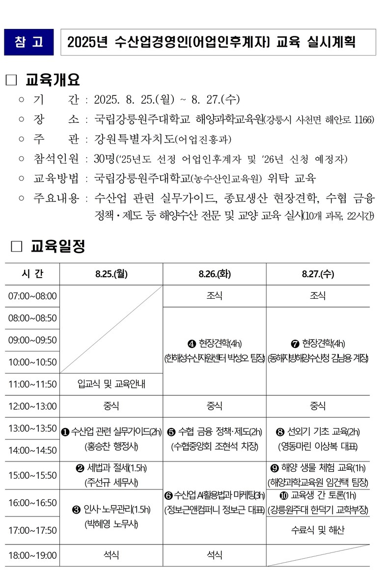 이번 교육은 해양수산부 지침에 따라 어업인후계자로 선정된 후 1년 이내 반드시 이수해야 하는 필수 과정으로, 매년 실시되고 있다. 올해는 국립강릉원주대학교 해양과학교육원에서 진행된다.