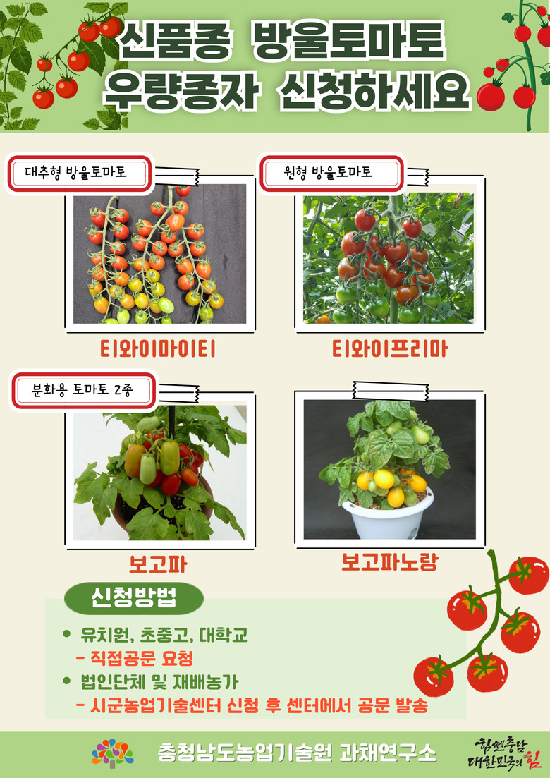 - 도 농기원, 재배농가·교육기관 대상 4품종 10만립 공급 - [충남 세계타임즈=이현진 기자] 충남도 농업기술원은 재배농가와 교육기관을 대상으로 신품종 방울토마토 우량종자 4종 10만립을 공급한다고 11일 밝혔다.