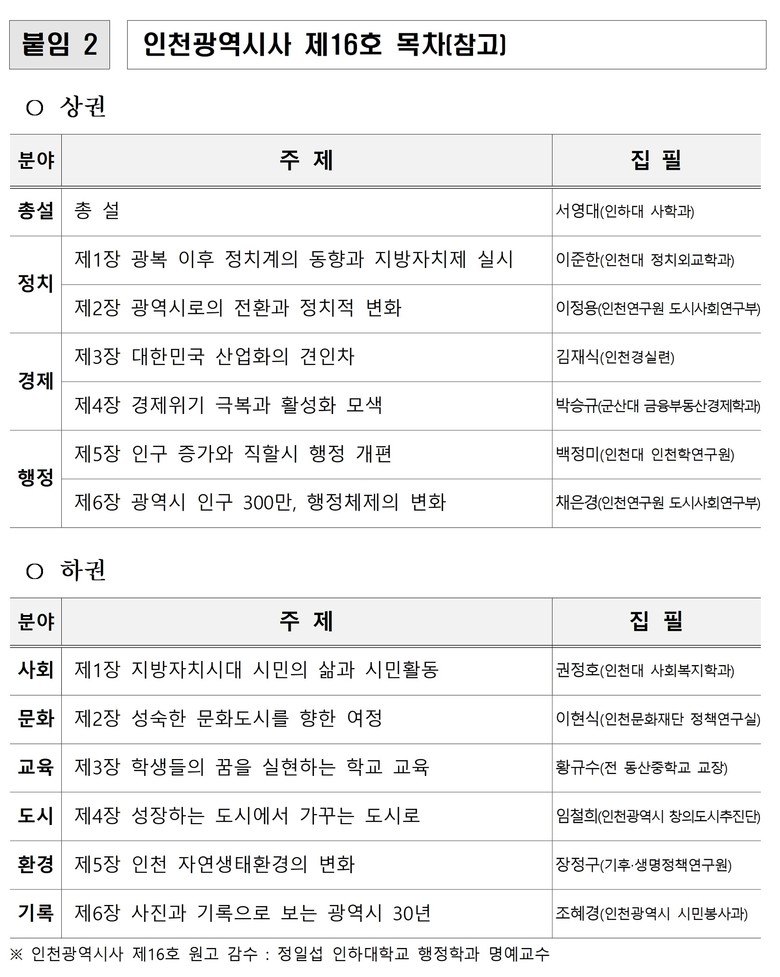 이번 ‘인천광역시 30년’은 총설과 12개 장으로 구성해 상·하 두 권으로 발간됐다. 집필에는 역사·정치·경제·행정·도시·환경·복지·문화 등 각 분야 전문가 13명이 참여했다.