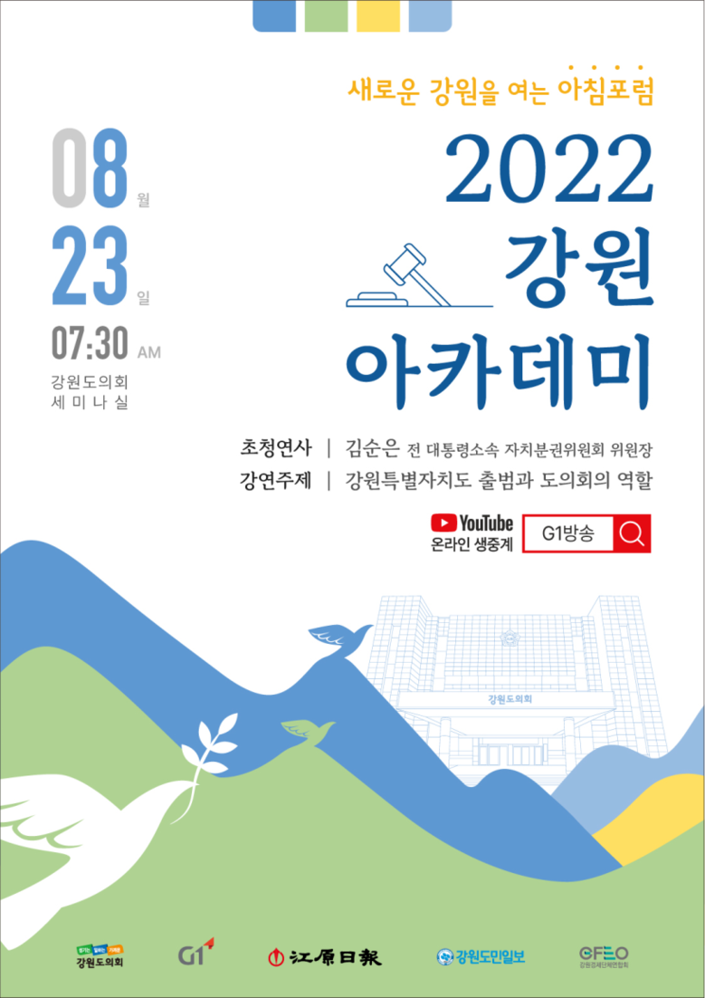 ‘강원아카데미’는 정치, 경제, 인문, 사회, 4차산업혁명 등 빠르게 변화하는 시대의 트랜드와 유용한 정보를 도민과 함께 공유하고 소통하기 위해 강원도의회가 매월 정례 개최(셋째주 화요일)하는 아침포럼으로,