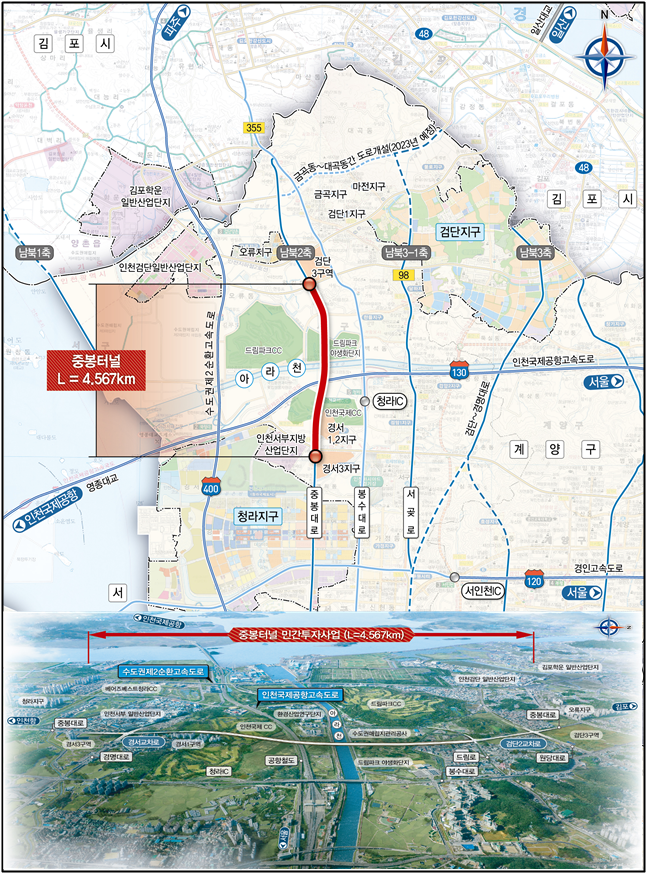 「중봉터널 민간투자사업」은 서구 경서동 경서삼거리에서 서구 왕길동 검단2교차로를 연결하는 총연장 4.567km, 왕복 4차로 규모의 지하터널을 건설하는 사업으로 우선협상대상자가 제안한 총사업비는 3,493억 원이며, 민간투자방식(BTO-a)으로 추진된다.