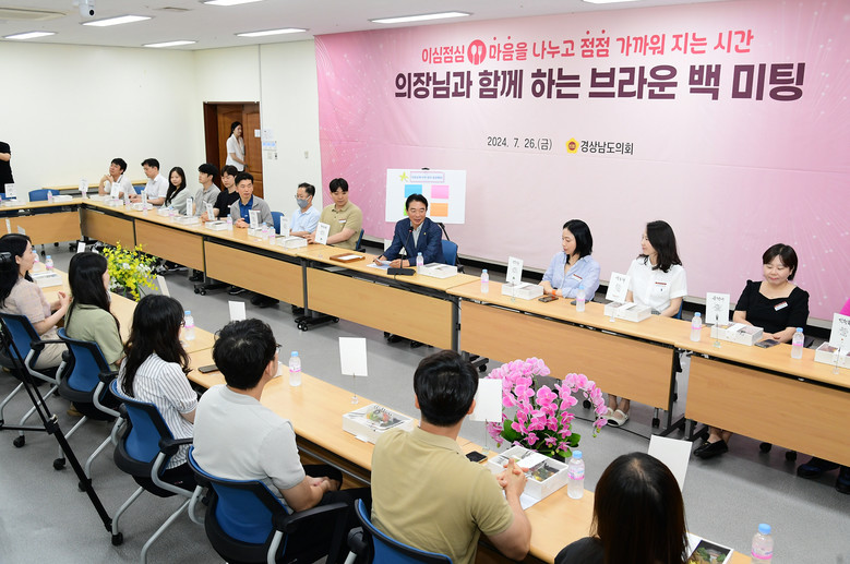 [경남 세계타임즈=최성룡 기자] 경상남도의회 최학범(국민의힘, 김해1) 의장은 26일 도의회 1층 대회의실에서 7급 이하 직원 39명이 참석하여 자유롭게 소통하는 브라운 백 미팅을 개최하였다.