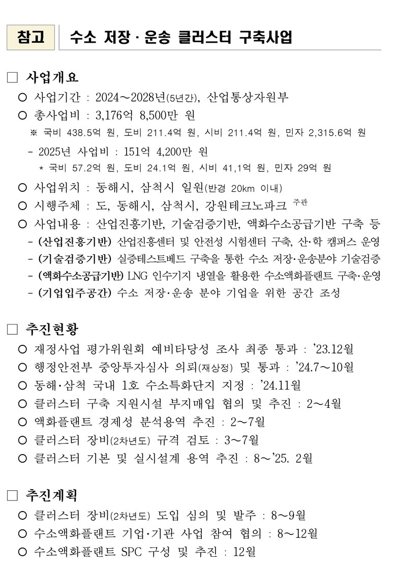 '28년까지 총 3,177억 원을 투입하여 동해시에 산업진흥센터, 안전성 시험센터, 시스템실증센터 등 건축물 3개 동과 연구장비 37종, 기업입주공간을 마련하고, 삼척시에는 수소액화플랜트를 구축할 계획이다.