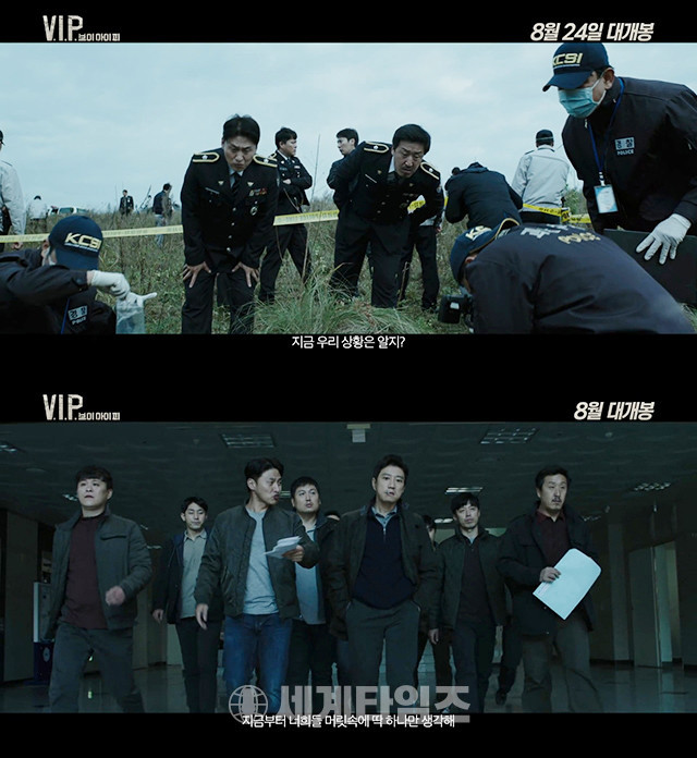 영화 '브이아이피' 2차 예고편이 시작하자마자, 경찰 정복을 입은 현봉식이 화면의 중앙에서 심각한 표정으로 살인 사건 현장을 지켜보는 모습이 등장해 네티즌들의 관심이 집중되고 있다.