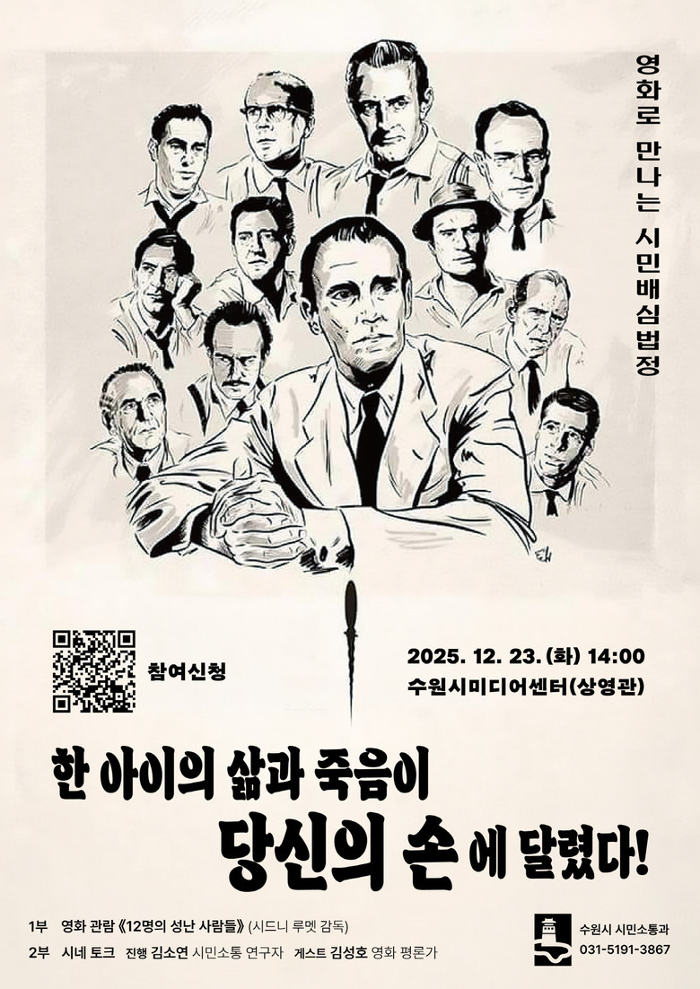 수원시 관계자는 “이번 행사는 단순한 영화 관람을 넘어 시민들이 스크린 속 배심원처럼 논의하는 소통 프로그램으로 기획했다”며 “많은 시민이 참여해 의미 있는 시간을 만들길 바란다”고 덧붙였다.