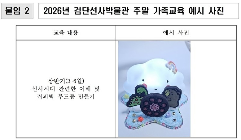 상반기인 3월부터 6월까지는 생활폐기물 재활용(업사이클링) 공예를 활용한 ‘나만의 선사시대 커피박 무드등 만들기’를 진행한다. 이어 9월부터 12월까지 운영되는 하반기 프로그램에서도 다양한 공예 기법을 활용한 선사시대 관련 만들기 체험이 이어질 예정이다.
