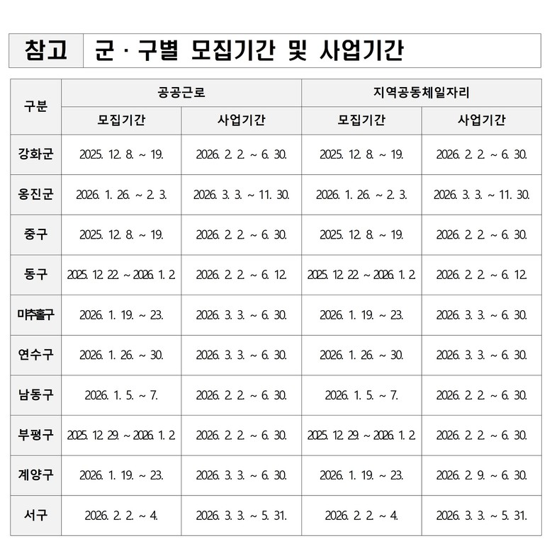 인천시는 2026년도 공공일자리 사업의 연간 채용 목표 인원을 총 695명으로 설정하고, 이 중 공공근로사업 420명, 지역공동체일자리사업 275명을 기준으로 인천시 10개 군·구에서 사업을 추진할 계획이다. 다만 이는 연간 목표 인원으로, 실제 채용 규모는 군·구별 수요와 사업 여건에 따라 조정될 수 있다.