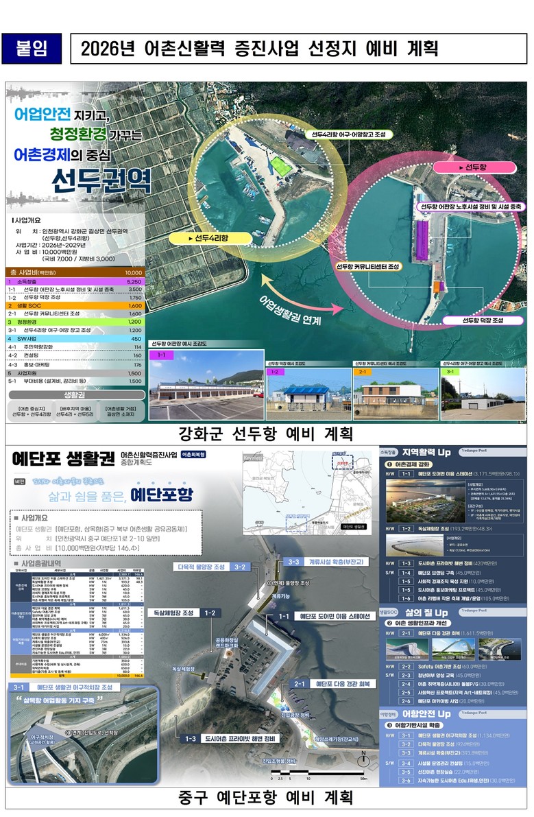 한편, 인천시는 2026년부터 2029년까지 단계적으로 사업을 추진할 예정이며, 어업기반시설 정비와 더불어 해양문화, 관광콘텐츠, 지역특산품 유통체계 개선 등을 결합한 통합형 어촌개발 모델을 구축할 계획이다.