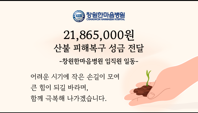 창원한마음병원 최경화 이사장은 "직원들이 한마음 한뜻으로 피해 주민들을 돕기 위해 성금을 마련했다는 점에서 더욱 의미가 깊다"라며 "이번 성금이 피해 주민들에게 작은 희망이 되기를 바란다"라고 전했다.