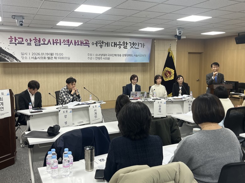 끝으로 전병주 부위원장은 “이번 토론회를 계기로 학교 앞 혐오시위와 역사왜곡 문제를 교육의 문제로 분명히 인식하고, 서울시의회 차원에서도 실질적인 대책 마련에 나서겠다”고 밝혔다.