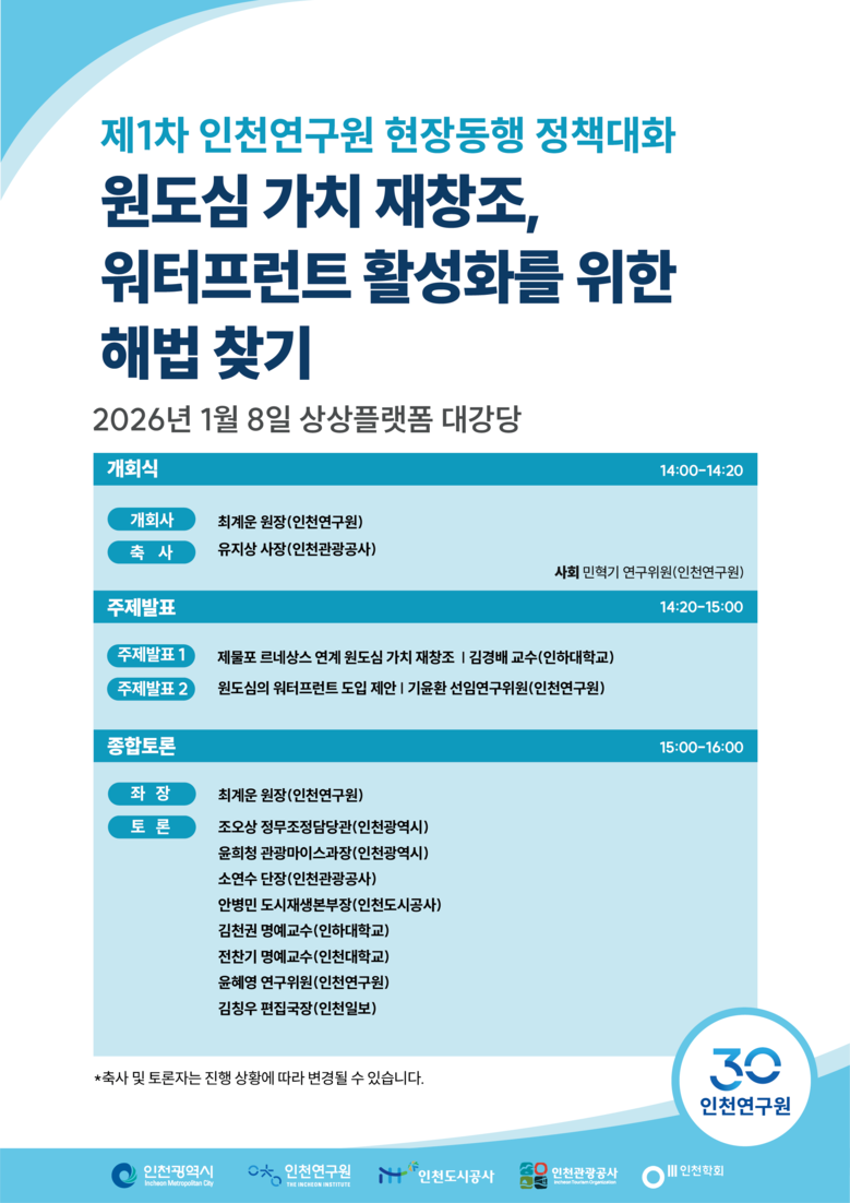 주제발표는 ▲인천학회 김경배 회장이 “제물포 르네상스 연계 원도심 가치 재창조”, ▲인천연구원 기윤환 선임연구위원이 “원도심의 워터프런트 도입 제안”을 주제로 진행한다.