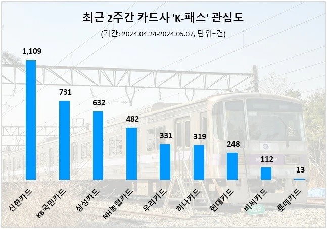 조사 결과 신한카드가 2주간 총 1,109 건의 정보량을 기록하며, K-패스 관심도 1위에 올랐다. 신한카드는 9개 카드사 중 유일하게 네자릿 수 정보량을 나타냈다.