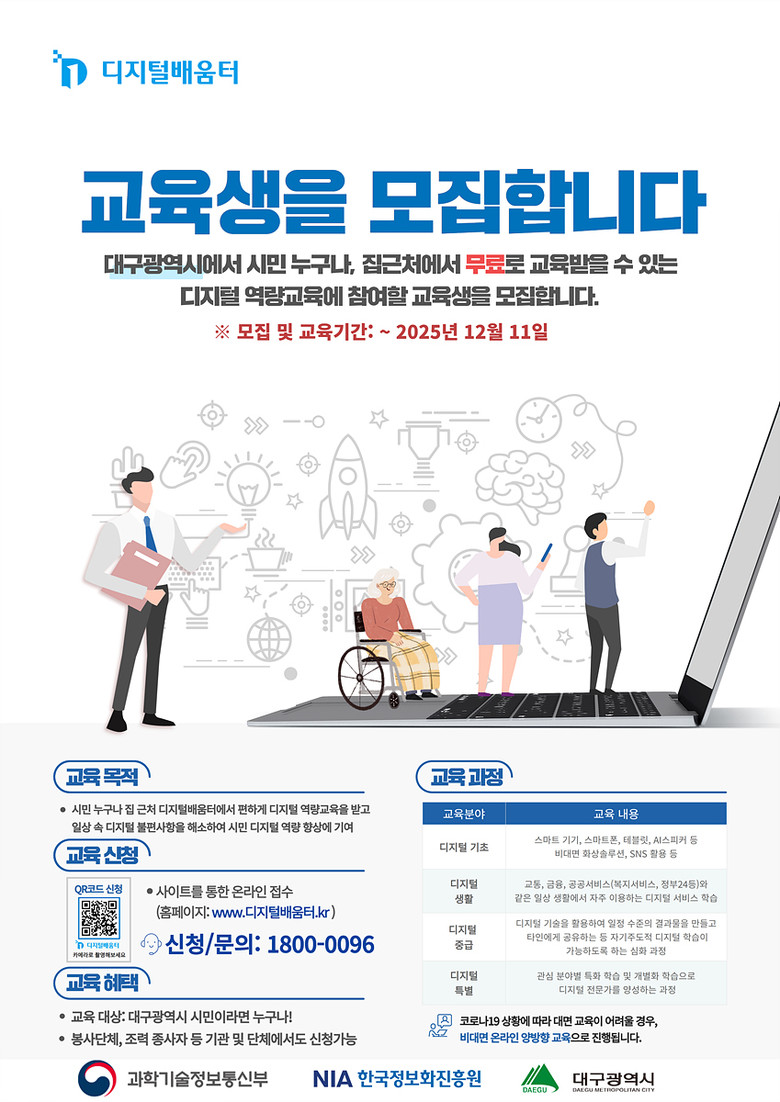 ▸ 5월부터 12월까지 시민 누구나 무료 신청 가능 [대구 세계타임즈=한윤석 기자] 대구광역시는 디지털 소외계층의 정보격차 해소와 디지털 역량 강화를 위해 오는 5월 12일(월)부터 ‘2025년 디지털배움터 교육’을 운영한다.
