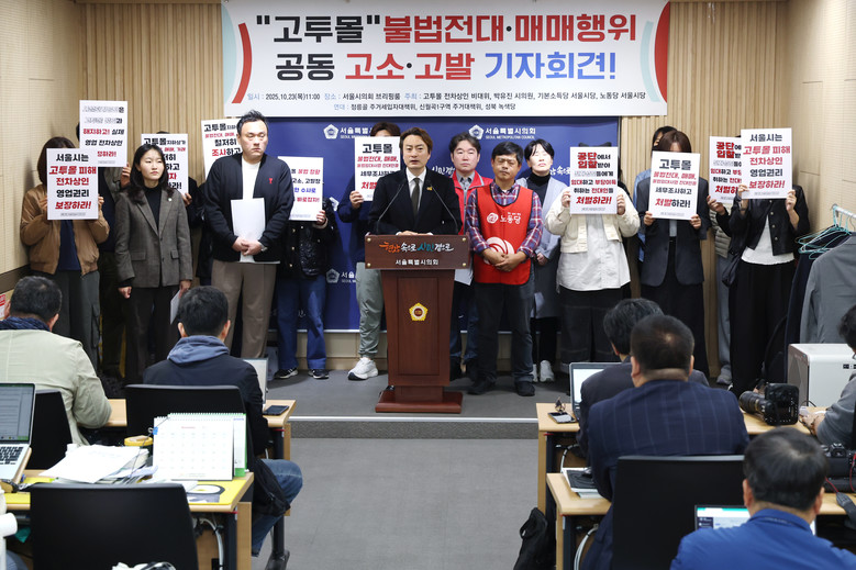 [서울 세계타임즈=이장성 기자] 박유진 서울시의원(더불어민주당, 은평3)은 23일 오전 서울시의회 의원회관에서 고투몰 전차상인 비상대책위원회, 기본소득당 서울시당, 노동당 서울시당과 함께 ‘고투몰 불법 전대·매매 행위 공동 고소·고발 기자회견’을 열고, 고투몰 내 불법 전대차 및 매매 행위의 즉각적인 근절과 책임자 엄중 처벌을 강력히 요구했다.