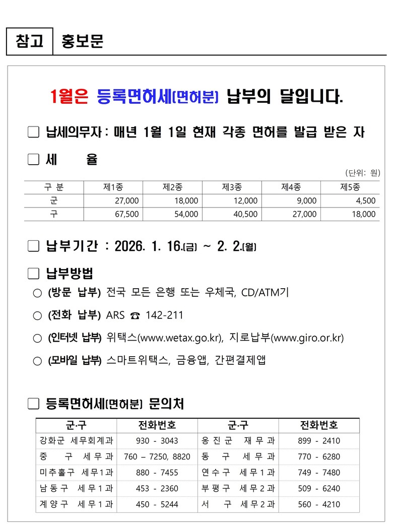[인천 세계타임즈=심하린 기자] 인천광역시(시장 유정복)는 2026년 정기분 등록면허세(면허분) 396,262건, 총128억 원을 부과·고지했다고 밝혔다.