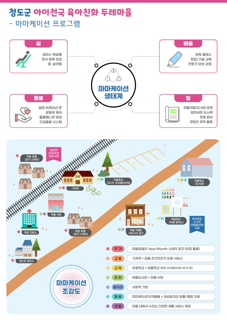청도군은 농촌형 생활 공동체 회복에 초점을 둔 생활 돌봄 중심 모델을 추진한다. 북살롱, 쉼 카페, 작은 도서관을 연계해 세대가 일상에서 교류하는 돌봄공간을 조성하고, 양육 클래스와 일자리‧창업 교육 등을 상시 운영해 돌봄, 교육, 일자리를 결합한 구조를 만든다. 특히 ‘엄마셰프단’ 과 ‘천 원 밥상’ 사업은 돌봄과 먹거리, 공동체 경제를 결합한 대표적 사례로, 가정의 생활 부담 완화와 지역 여성의 일자리 창출로 이어지는 선순환 구조를 형성한다.