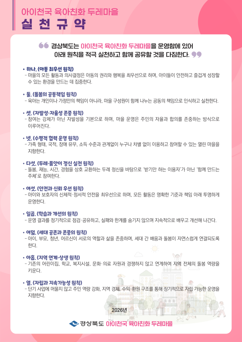 경북도는 두레마을의 핵심인‘자생공동체’ 활성화를 위해 주민들이 자발적으로 운영에 참여하고 지속 가능한 공동체를 유지할 수 있도록 ‘아이천국 육아친화 두레마을 10대 실천규약(안)’을 마련했다.