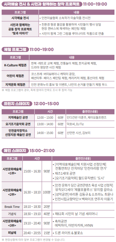이번 행사는 제61회 시민의 날 기념과 재외동포 인천 교류·방문의 해를 맞아 시민과 재외동포가 함께 즐길 수 있는 문화예술 축제의 장으로 마련된다.
